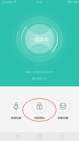 2、进入手机管家后,打开权限隐私。