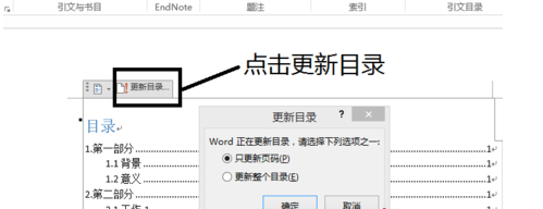7、如果标题发生变化的时候,可以选中目录,然后点击“更新目录”按钮,在弹出来的小窗口中选择“更新整个目录”,这样目录就会自动更新了哦。