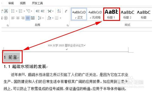 2、然后选中一级标题,点击样式里的“标题1”,接着依次将所有的一级标题进行设置;