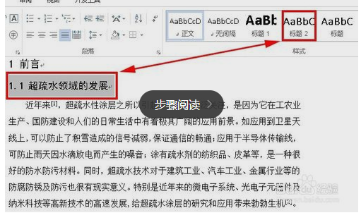 2、一级标题标记处理完成后,我们开始标记二级标题(隶属于一级标题如1.1)。操作同上:先用鼠标选中二级标题,然后单击页面右上方“标题2”选项如下图红色框选中位置所示,就像这样从前到后选中所有二级标题。