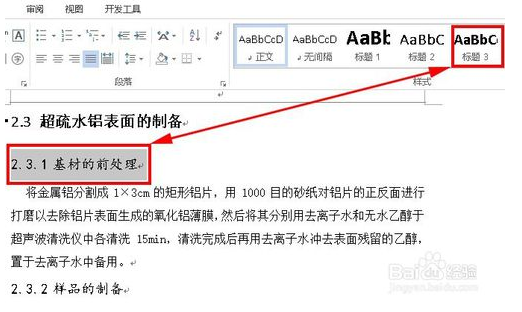 3、所有二级标题处理完后,我们就开始标记三级标题(隶属于二级标题如1.1.1).操作同上:先用鼠标选中三级标题,然后单击页面右上方“标题3”选项如下图红色框选中位置所示,就像这样从前到后选中所有三级标题。如有四级级以后标题以此类推。