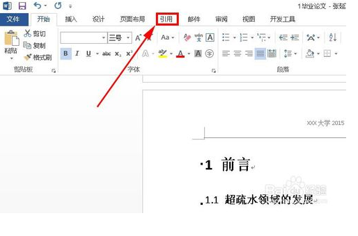 4、在所有标题的样式都设置完成后,就可以开始添加目录了,首先将光标定位到要添加目录的地方,然后在word选中“引用”选项卡;