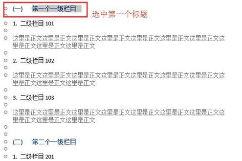 6、在大纲视图中,可以看到所有的栏目标题和正文的前面,都出现了小圆圈。不用管它,先选中第一个标题。