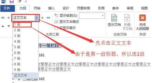 2.然后选中要加入目录章节前面的小圆圈(注意:只选择一排,如图所示),然后点击上方的正文文本将它切换成N级标题(第N章 算1级标题,1.N 算2级,1.N.N算3级,以此类推),如果只想在目录里保留几个级别的标题,那么在大纲视图里不为不想显示标题章节进行分级。