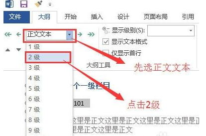 9、然后点击工具栏中的“正文文本”,在弹出的下拉列表中选择“2级”。