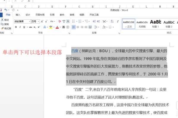 鼠标在任意段落的空白处点击两下,可选择此段落。