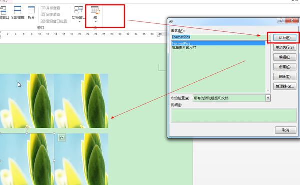 3.宏-运行,可以直接批量缩放图片尺寸,左边为最终效果图。