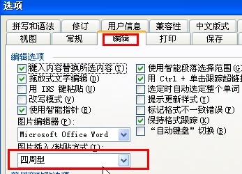 2、在”选项“窗口中,在”编辑”选项卡下,将插入图片的格式选择为“四周型”;
