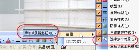 5、在“绘图”工具栏中的“添加或删除按钮”中选择“选中多个对象”;