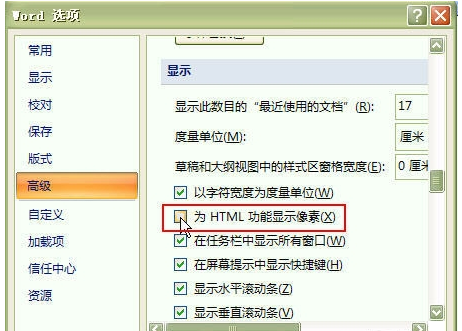 打开Word窗口,依次单击“Office按钮→Word选项”命令,在打开的对话框中选择“高级”选项卡,然后在“显示”标签区域中勾选掉“为html功能显示像素”复选框,单击“确定”按钮,即可查看图片属性为厘米。