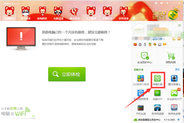 1.下载安装一个360安全卫士,打开360安全卫士,在功能中,点击更多功能,添加弹窗拦截功能。