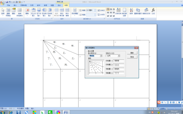 2、点击表格——绘制斜线表格——选取样式——修改字号——输入标题内容——确定