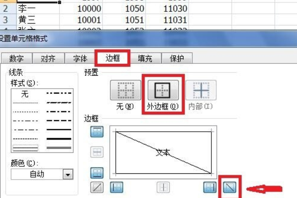 2、在“边框”选项卡,点击右侧“预览”区左上右下斜线图标,即可在单元格内画上斜线。