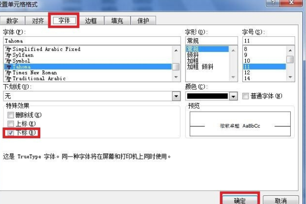 5、右键单击单元格A1,选择设置单元格格式,选择字体,检查下标,单击确定,然后在单元格A1中输入名称。
