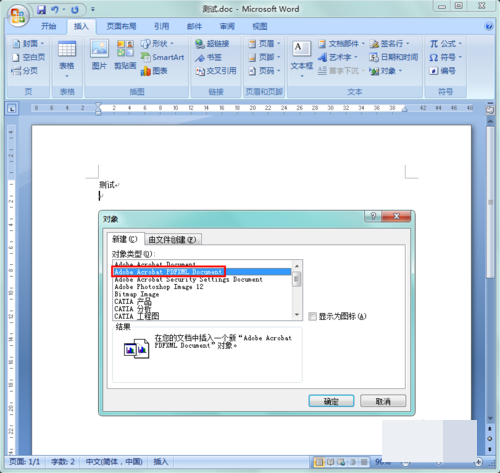 3、找到“对象”之后,点击“对象”即可弹出插入“对象”选项对话框,然后在“对象”里面选着pdf格式选项,然后选择要插入的文件即可;