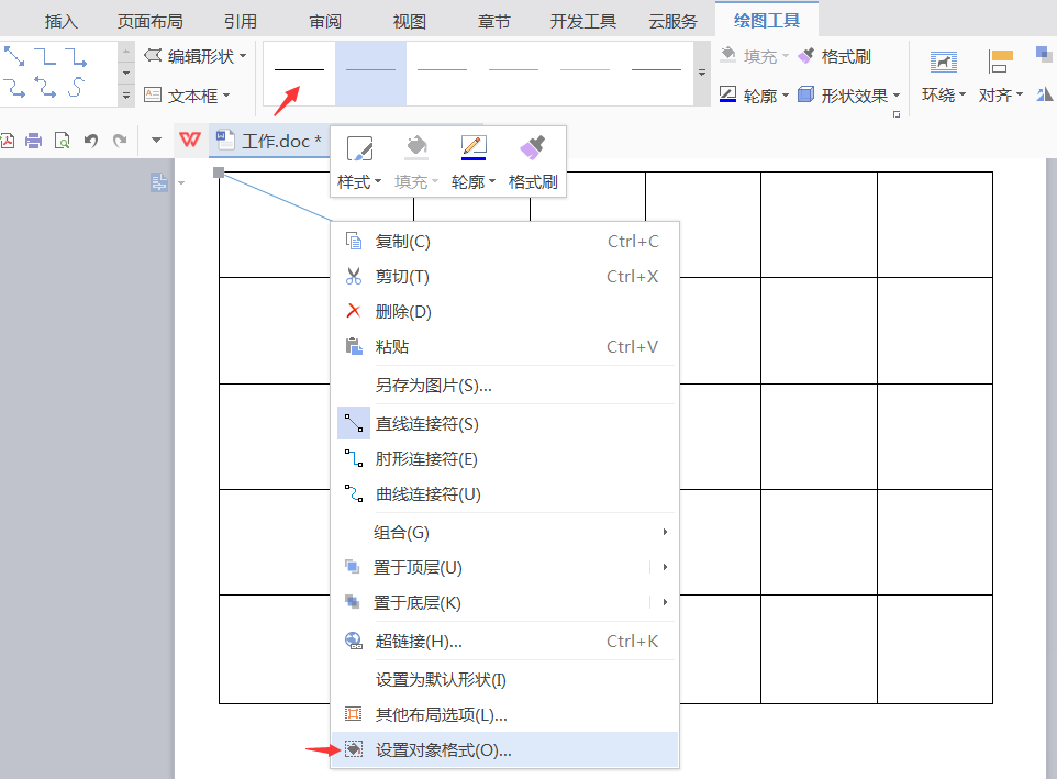 将光标放在画好的线条上,选择表头的颜色设置,或右击鼠标选择“设置对象格式”中“填充与线条”根据自己的需求设置线条的颜色,如下图;