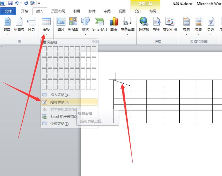 2.点击“表格”选项,然后点击“绘制表格”,之后鼠标的箭头将会成笔状,再点击要设置斜线的单元左上角拖动到单元格右下角即可。