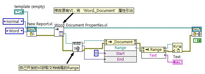 图中有一个是关键步骤,就是修改原有VI,将Word._Document’属性引出,然后关键该属性开发自己需要的东西。(因为NI提供的report引用是个锁定的类,我们无法直接使用。)