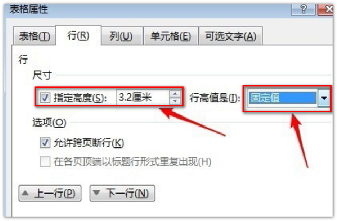 2、在表格属性对话框,选择“行”选项卡,勾选“指定高度”,调整满意的高度值,行高值是“固定值”。
