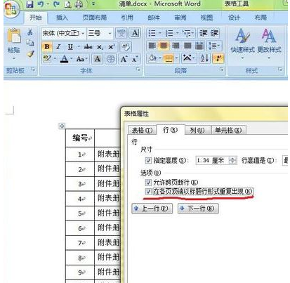 3、在弹出的表格属性对话框中,点击“行”属性,勾选”在各页顶端以标题形式重复出现“选项,然后点击确定。