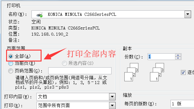 4、如果点击“全部”的话就是默认打印文档中所有的内容,包括空白页。