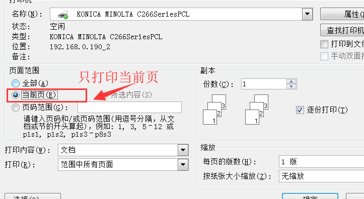 5、选择“当前页”的话就只打印目前鼠标所在的那一页内容。