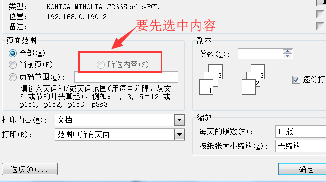 7、如果只想打印某一部分内容的话,要提前在文档中选中想要打印的内容,然后在操作前三步,选择“所选内容”,如果没有事先选中的话就可以看到“所选内容”选项是灰色的。