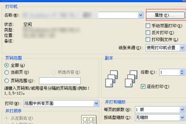 2、首先,选择要使用的打印机,然后单击右侧的属性以设置纸张和纸盘。