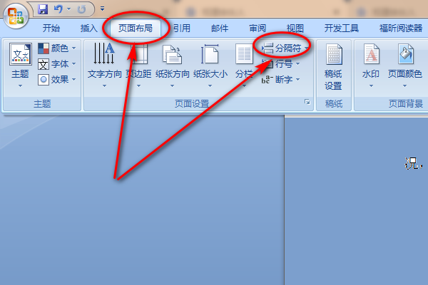 2、在需要设置横版与竖版不同的地方插入鼠标,并在打开的word文档任务栏中选择页面布局,在页面布局界面选择分隔符选项。