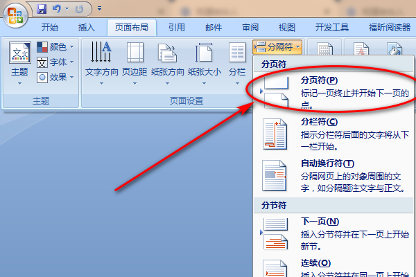 3、在分隔符下拉菜单中选择分页符选项,对需要设置的地方进行分页设置。