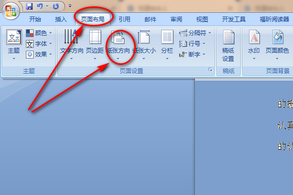 4、完成分页设置后,在word文档任务栏选择页面布局,在页面布局界面选择纸张方向,点击进入对纸张方向进行设置。