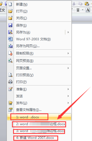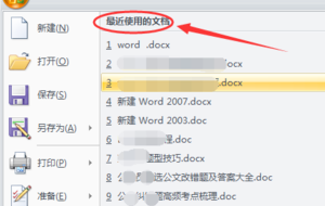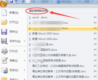 2、点击word左上角的office按钮,然后在弹出的下拉菜单中可以看到“最近使用的文件”,可以看到最近访问的文档,如图所示。