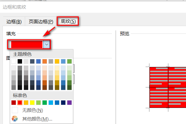 4、在弹出的“边框和底纹”对话框中切换到“底纹”选项卡,将颜色设置为“红色”。