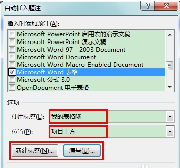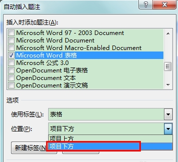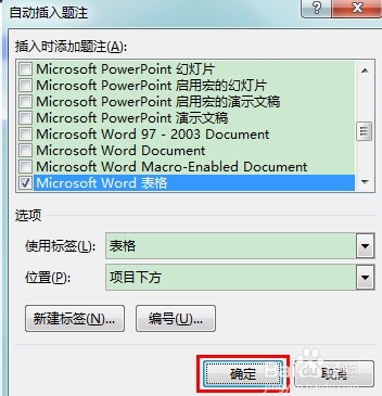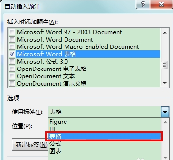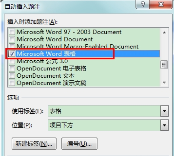 在自动插入题注对话框中,找到【Microsoft Word 表格】,并勾选。