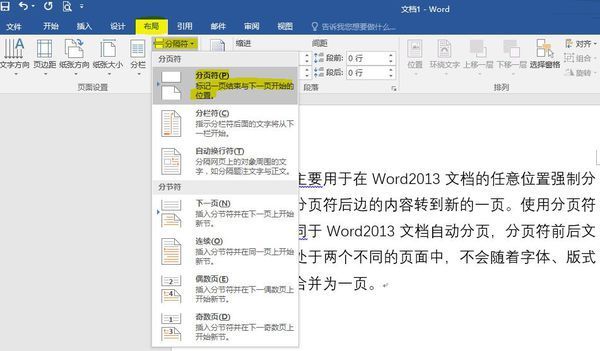 3、在“布局”(或“页面布局”)选项下的“分隔符”中,选择“分页符”,标记一页结束与下一页开始的位置;