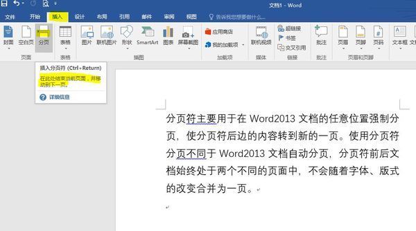 如果想到某一段以后,后面就不在连着了,下一个段落放到下一页去,这时候就需要在这个段落后面加一个分页符。
