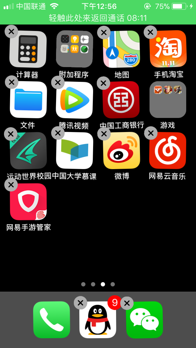 2、按住QQ游戏大厅应用图标大约3秒左右,即可看到可以卸载的应用图标做商家有一个x按钮,并且应用图标都在抖动,这个时候,我们就可以再点击这个X按钮,卸载需要卸载的软件了。