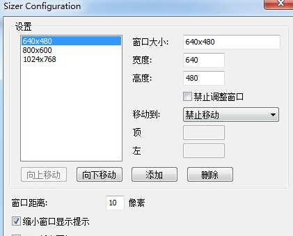 Sizer内置了常用的640x480、800x600和1024x768大小方案,还可以自定义大小方案。