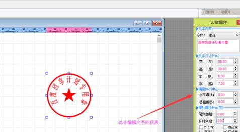 5、这里面都是以毫米为计量单位的,中心定位:在工作区的位置。主边框:印章边框。这些数据都可以改的。改好后,点击上方的中心定位,可以回到编辑主界面