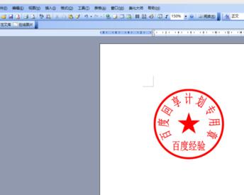 5、在word文档内的“工具栏”上选择插入,图形选择五角星,然后在文档中画出一个大小适合的五角星,并设置成红色,移动到圆中合适的位置,然后选中圆、艺术字、五角星,单击鼠标右键,选择“组合”,一个公章就制作出来了,如图;