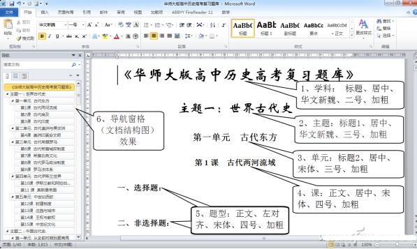 以“华师大版高中历史课程”为例,根据教材内容,按“学科→主题→单元→课→题型→试题”的结构顺序,通过复制、粘贴、修改文字的方式,就可以搭建起整个题库文档的框架结构(图1)。