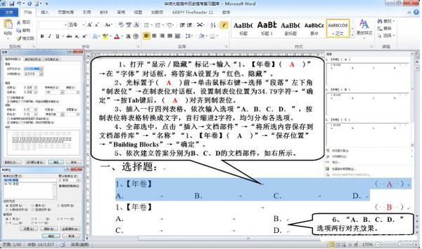 在Word 2010中,我们可以通过“制表位”来精确控制“A.B.C.D.”选项的对齐效果,确保题库文档的整洁美观。同时我们还可以通过建立“文档部件”的方式来减少重复劳动,提高工作效率(图2)。