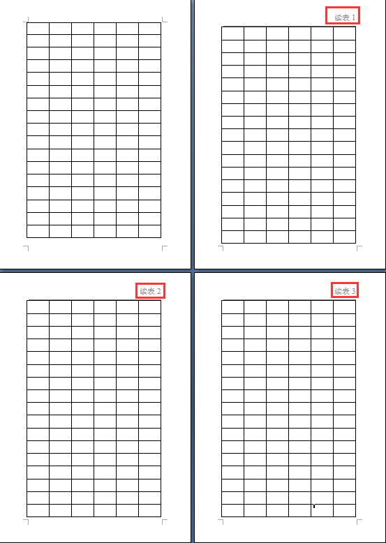 方案三:在表格的第一页末行插入一个空行,同时在第二页的首行之前也插入一个空行,第一页的最后一行边框设置为:上边框,不要左,右,下边框;在第二页第一行里面写“续表”,然后把这一行的边框设置为:下边框,不要左、右、上边框。(可以解决方案二中多线条或者少线条的问题)