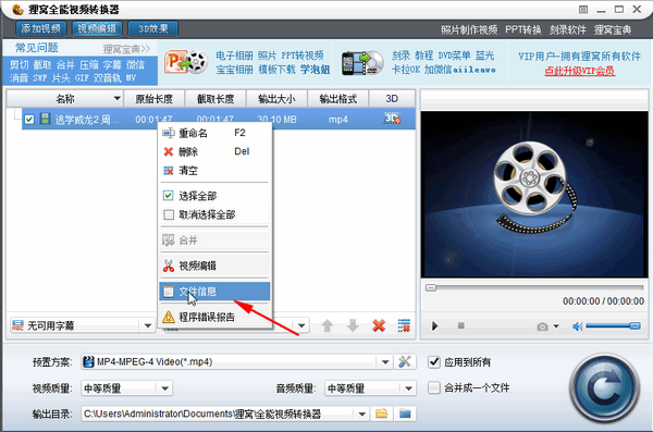 2.添加视频之后,鼠标右键点击软件列表里的视频,然后会出来一个文件的几个选项,我们选择文件信息,可以查看到该视频文件的大小和帧率、比特率这些,显然视频文件大小30MB是不行的。微信肯定发布出去这么大的文件,所以后续要压缩一下,更改文件的一些参数等。