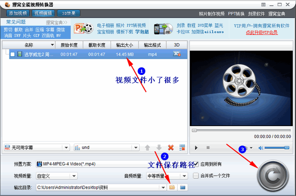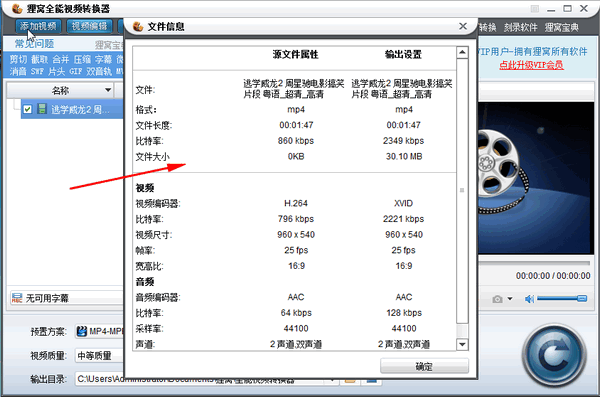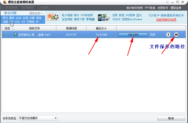 4.这里就可以看到视频变成了1.6MB多了,小了非常多,这个文件大小,显然符号微信的视频文件限制范围之内,所以尽管大胆使用它,最后这里把视频文件保存和输出就行了,点击底部的保存目录设置一下保存的路径,然后点击右下角的合成转换按钮就行了,完成时会显示进度条100%。