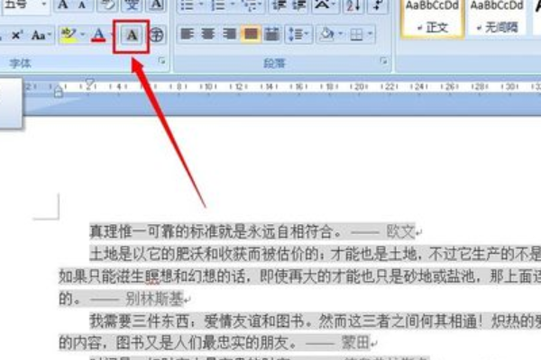 1、单文字有阴影,简单方法是选中有阴影的文字,单击“开始”中带底纹的A字就可以去掉底纹了。(还有一种可能“以不同颜色突出显示文本”和单文字阴影差不多,阴影上下稍宽些,处理方法:选中文字,开始----字体----单击ab/这个按钮后鼠标在文字上拖动即可)。