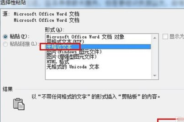 4、并在弹出的窗口中,选择“无格式文件”项,点击“确定”完成粘贴操作。
