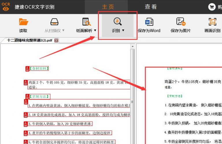 然后,等图片打开以后,我们点击上方的“识别”按钮,软件就开始自动识别图片了。用不了多久,图片就会识别成文字,展示在右边。