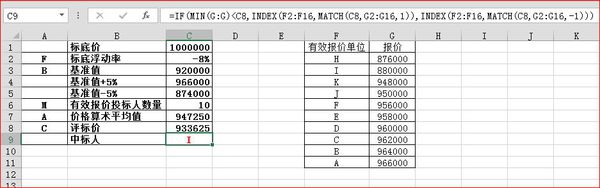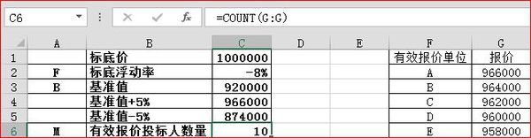 2、根据基准值的上下浮动,计算上下限,并对报价单位进行筛选,将有效报价单位列表;
