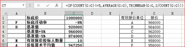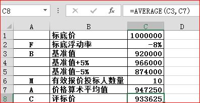 5、计算评标价:=AVERAGE(C3,C7)